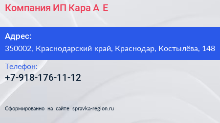 Компания, ИП Кара А.Е. по адресу 350002, Краснодарский край, Краснодар, Костылёва, 148 в дальнейшем Организация, размещена в следующих категориях: