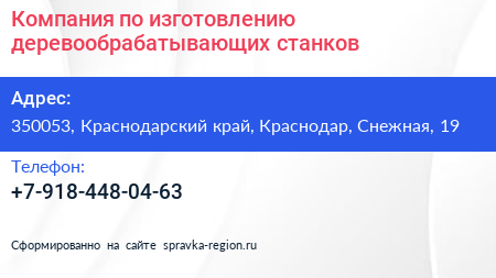 Компания по изготовлению деревообрабатывающих станков по адресу 350053, Краснодарский край, Краснодар, Снежная, 19 в дальнейшем Организация, размещена в следующих категориях: