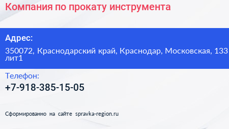 Компания по прокату инструмента по адресу 350072, Краснодарский край, Краснодар, Московская, 133 лит1 в дальнейшем Организация, размещена в следующих категориях: