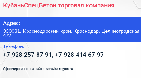 КубаньСпецБетон, торговая компания по адресу 350031, Краснодарский край, Краснодар, Целиноградская, 4/2 в дальнейшем Организация, размещена в следующих категориях: