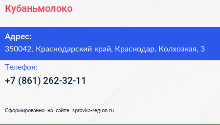 Кубаньмолоко по адресу 350042, Краснодарский край, Краснодар, Колхозная, 3 в дальнейшем Организация, размещена в следующих категориях: