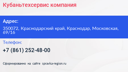 Кубаньтехсервис, компания по адресу 350072, Краснодарский край, Краснодар, Московская, 69/16 в дальнейшем Организация, размещена в следующих категориях: