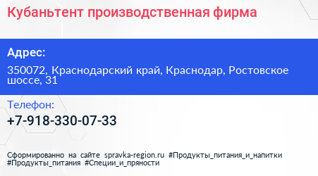 Кубаньтент, производственная фирма по адресу 350072, Краснодарский край, Краснодар, Ростовское шоссе, 31 в дальнейшем Организация, размещена в следующих категориях:
