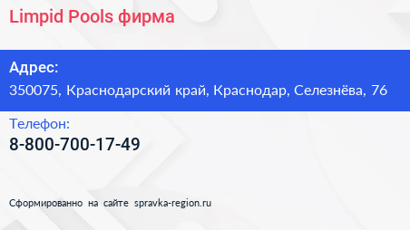 Limpid Pools, фирма по адресу 350075, Краснодарский край, Краснодар, Селезнёва, 76 в дальнейшем Организация, размещена в следующих категориях:
