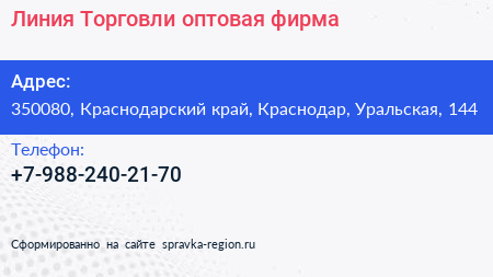 Линия Торговли, оптовая фирма по адресу 350080, Краснодарский край, Краснодар, Уральская, 144 в дальнейшем Организация, размещена в следующих категориях: