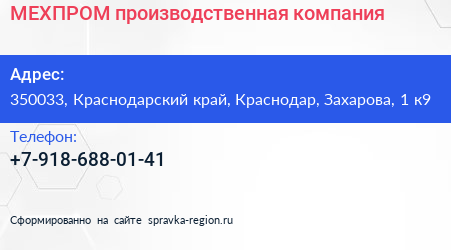 МЕХПРОМ, производственная компания по адресу 350033, Краснодарский край, Краснодар, Захарова, 1 к9 в дальнейшем Организация, размещена в следующих категориях:
