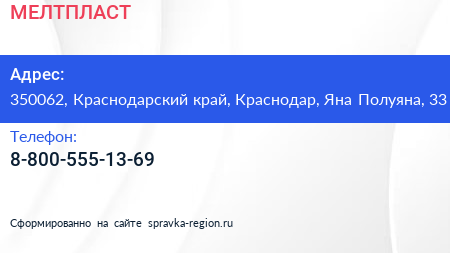 МЕЛТПЛАСТ по адресу 350062, Краснодарский край, Краснодар, Яна Полуяна, 33 в дальнейшем Организация, размещена в следующих категориях: