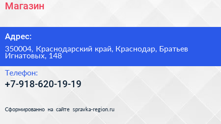 Магазин по адресу 350004, Краснодарский край, Краснодар, Братьев Игнатовых, 148 в дальнейшем Организация, размещена в следующих категориях: