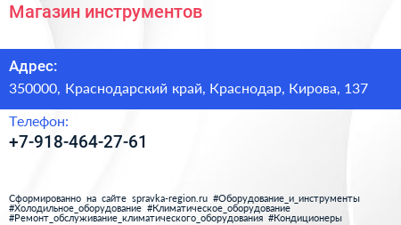 Магазин инструментов по адресу 350000, Краснодарский край, Краснодар, Кирова, 137 в дальнейшем Организация, размещена в следующих категориях: