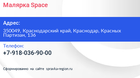 Малярка Space по адресу 350049, Краснодарский край, Краснодар, Красных Партизан, 136 в дальнейшем Организация, размещена в следующих категориях: