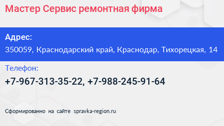 Мастер Сервис, ремонтная фирма по адресу 350059, Краснодарский край, Краснодар, Тихорецкая, 14 в дальнейшем Организация, размещена в следующих категориях: