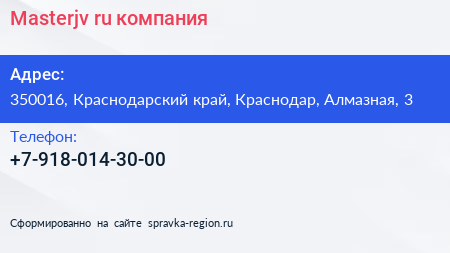Masterjv.ru, компания по адресу 350016, Краснодарский край, Краснодар, Алмазная, 3 в дальнейшем Организация, размещена в следующих категориях: