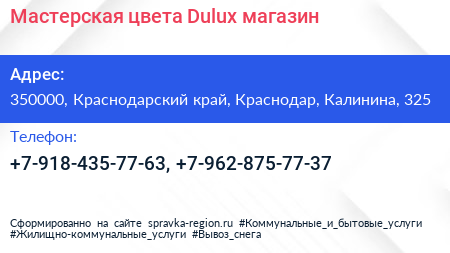 Мастерская цвета Dulux, магазин по адресу 350000, Краснодарский край, Краснодар, Калинина, 325 в дальнейшем Организация, размещена в следующих категориях: