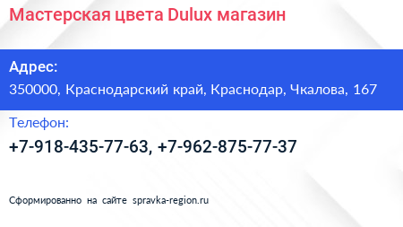 Мастерская цвета Dulux, магазин по адресу 350000, Краснодарский край, Краснодар, Чкалова, 167 в дальнейшем Организация, размещена в следующих категориях: