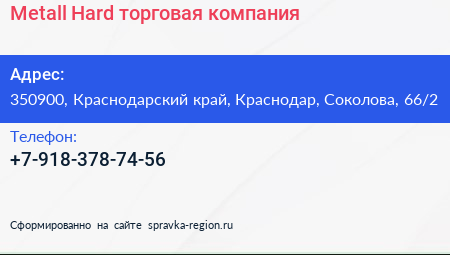 Metall Hard, торговая компания по адресу 350900, Краснодарский край, Краснодар, Соколова, 66/2 в дальнейшем Организация, размещена в следующих категориях: