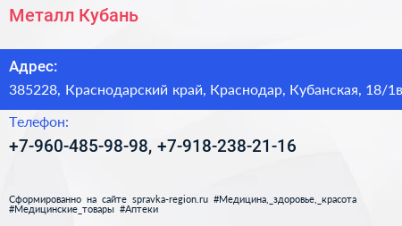Металл-Кубань по адресу 385228, Краснодарский край, Краснодар, Кубанская, 18/1в в дальнейшем Организация, размещена в следующих категориях: