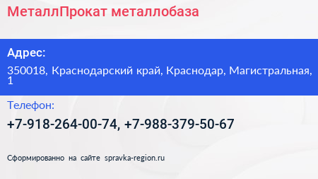 МеталлПрокат, металлобаза по адресу 350018, Краснодарский край, Краснодар, Магистральная, 1 в дальнейшем Организация, размещена в следующих категориях: