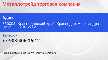 Металлотрейд, торговая компания по адресу 350005, Краснодарский край, Краснодар, Александра Покрышкина, 2/12 в дальнейшем Организация, размещена в следующих категориях: