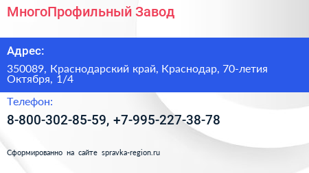 МногоПрофильный Завод по адресу 350089, Краснодарский край, Краснодар, 70-летия Октября, 1/4 в дальнейшем Организация, размещена в следующих категориях: