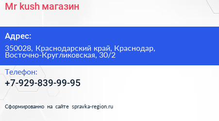 Mr.kush, магазин по адресу 350028, Краснодарский край, Краснодар, Восточно-Кругликовская, 30/2 в дальнейшем Организация, размещена в следующих категориях: