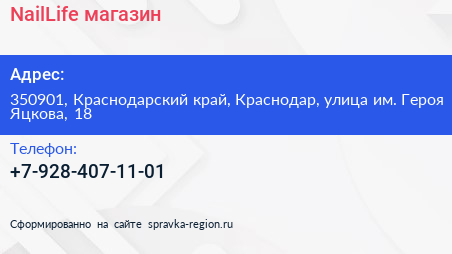 NailLife, магазин по адресу 350901, Краснодарский край, Краснодар, улица им. Героя Яцкова, 18 в дальнейшем Организация, размещена в следующих категориях: