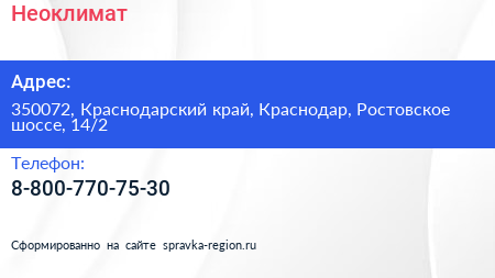 Неоклимат по адресу 350072, Краснодарский край, Краснодар, Ростовское шоссе, 14/2 в дальнейшем Организация, размещена в следующих категориях: