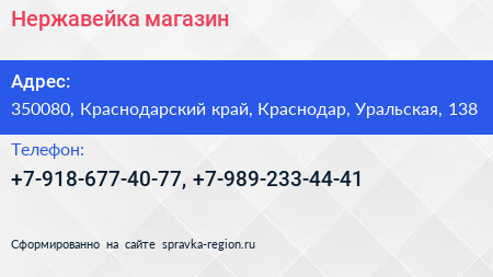 Нержавейка, магазин по адресу 350080, Краснодарский край, Краснодар, Уральская, 138 в дальнейшем Организация, размещена в следующих категориях: