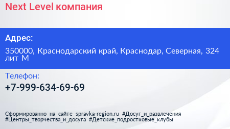 Next-Level, компания по адресу 350000, Краснодарский край, Краснодар, Северная, 324 лит М в дальнейшем Организация, размещена в следующих категориях: