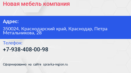 Новая мебель, компания по адресу 350024, Краснодарский край, Краснодар, Петра Метальникова, 28 в дальнейшем Организация, размещена в следующих категориях: