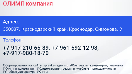 ОЛИМП, компания по адресу 350087, Краснодарский край, Краснодар, Симонова, 9 в дальнейшем Организация, размещена в следующих категориях: