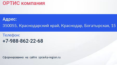 ОРТИС, компания по адресу 350055, Краснодарский край, Краснодар, Богатырская, 15 в дальнейшем Организация, размещена в следующих категориях: