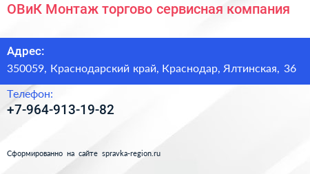 ОВиК-Монтаж, торгово-сервисная компания по адресу 350059, Краснодарский край, Краснодар, Ялтинская, 36 в дальнейшем Организация, размещена в следующих категориях: