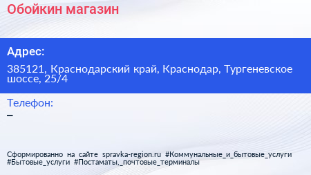 Обойкин, магазин по адресу 385121, Краснодарский край, Краснодар, Тургеневское шоссе, 25/4 в дальнейшем Организация, размещена в следующих категориях: