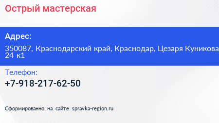Острый, мастерская по адресу 350087, Краснодарский край, Краснодар, Цезаря Куникова, 24 к1 в дальнейшем Организация, размещена в следующих категориях:
