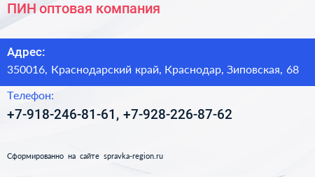 ПИН, оптовая компания по адресу 350016, Краснодарский край, Краснодар, Зиповская, 68 в дальнейшем Организация, размещена в следующих категориях: