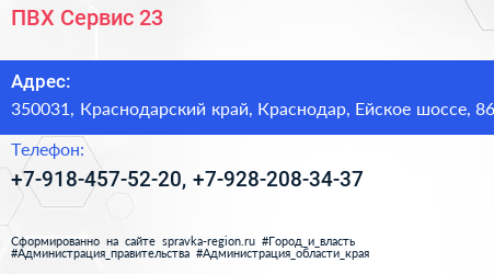 ПВХ-Сервис 23 по адресу 350031, Краснодарский край, Краснодар, Ейское шоссе, 86 в дальнейшем Организация, размещена в следующих категориях:
