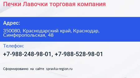 Печки-Лавочки, торговая компания по адресу 350080, Краснодарский край, Краснодар, Симферопольская, 48 в дальнейшем Организация, размещена в следующих категориях: