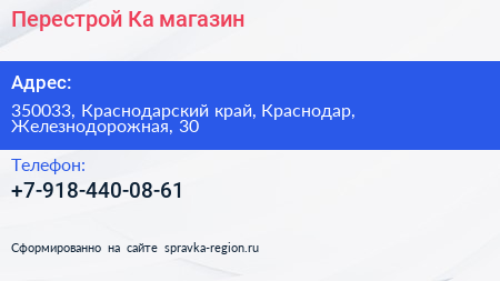 Перестрой-Ка, магазин по адресу 350033, Краснодарский край, Краснодар, Железнодорожная, 30 в дальнейшем Организация, размещена в следующих категориях: