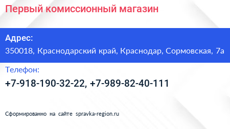 Первый комиссионный магазин по адресу 350018, Краснодарский край, Краснодар, Сормовская, 7а в дальнейшем Организация, размещена в следующих категориях: