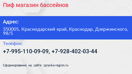 Пиф, магазин бассейнов по адресу 350005, Краснодарский край, Краснодар, Дзержинского, 98/5 в дальнейшем Организация, размещена в следующих категориях: