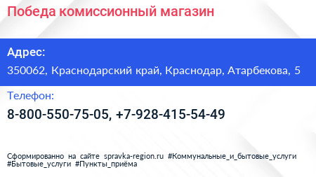 Победа, комиссионный магазин по адресу 350062, Краснодарский край, Краснодар, Атарбекова, 5 в дальнейшем Организация, размещена в следующих категориях: