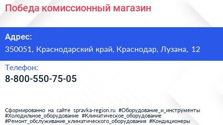 Победа, комиссионный магазин по адресу 350051, Краснодарский край, Краснодар, Лузана, 12 в дальнейшем Организация, размещена в следующих категориях: