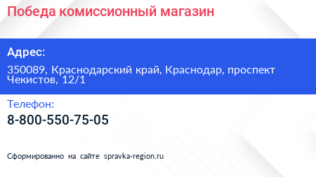 Победа, комиссионный магазин по адресу 350089, Краснодарский край, Краснодар, проспект Чекистов, 12/1 в дальнейшем Организация, размещена в следующих категориях: