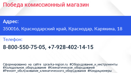 Победа, комиссионный магазин по адресу 350016, Краснодарский край, Краснодар, Карякина, 18 в дальнейшем Организация, размещена в следующих категориях: