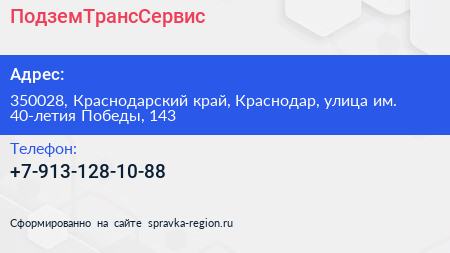 ПодземТрансСервис по адресу 350028, Краснодарский край, Краснодар, улица им. 40-летия Победы, 143 в дальнейшем Организация, размещена в следующих категориях: