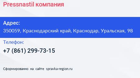 Pressnastil, компания по адресу 350059, Краснодарский край, Краснодар, Уральская, 98 в дальнейшем Организация, размещена в следующих категориях: