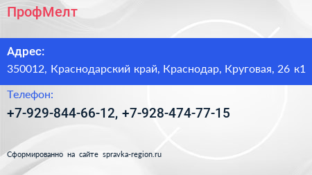 ПрофМелт по адресу 350012, Краснодарский край, Краснодар, Круговая, 26 к1 в дальнейшем Организация, размещена в следующих категориях: