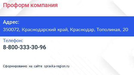 Проформ, компания по адресу 350072, Краснодарский край, Краснодар, Тополиная, 20 в дальнейшем Организация, размещена в следующих категориях: