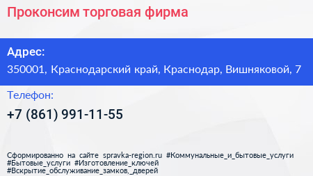 Проконсим, торговая фирма по адресу 350001, Краснодарский край, Краснодар, Вишняковой, 7 в дальнейшем Организация, размещена в следующих категориях: