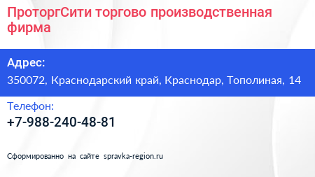 ПроторгСити, торгово-производственная фирма по адресу 350072, Краснодарский край, Краснодар, Тополиная, 14 в дальнейшем Организация, размещена в следующих категориях: